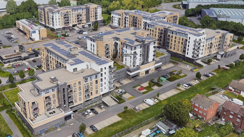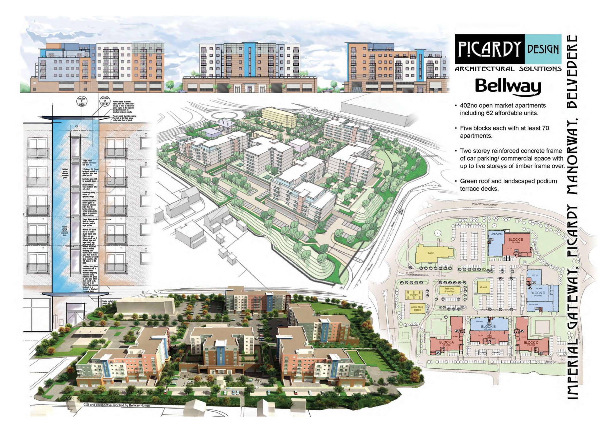 402 private apartments in 5 blocks with concrete podium and either multi storey parking and/or mixed use space for Bellway Homes Thames Gateway (CGIs supplied by Bellway Homes)